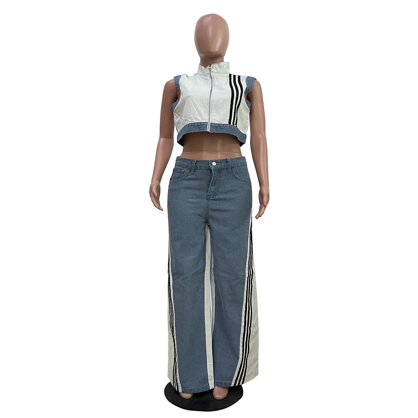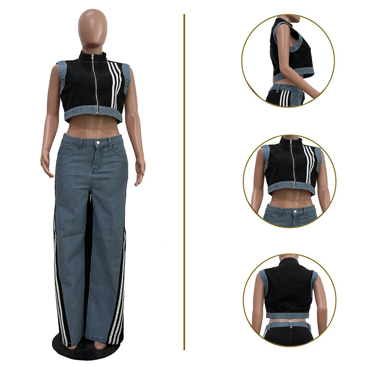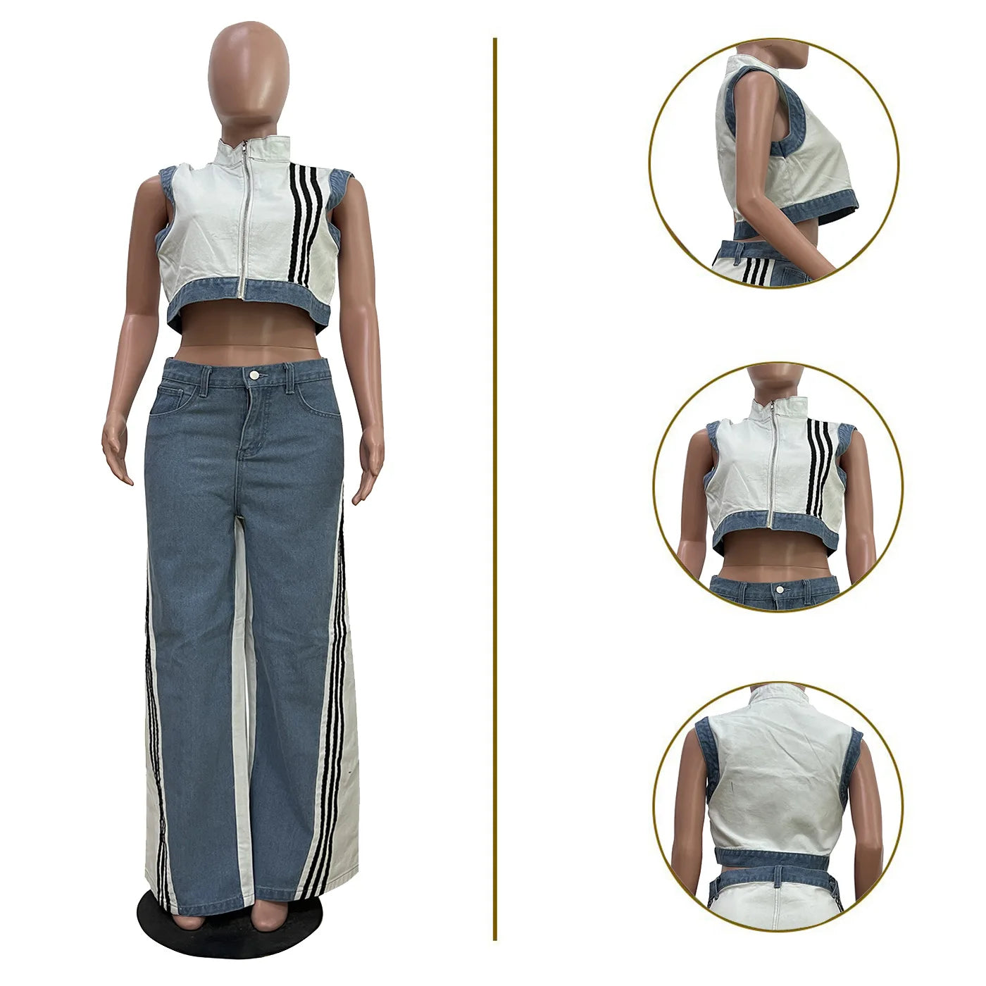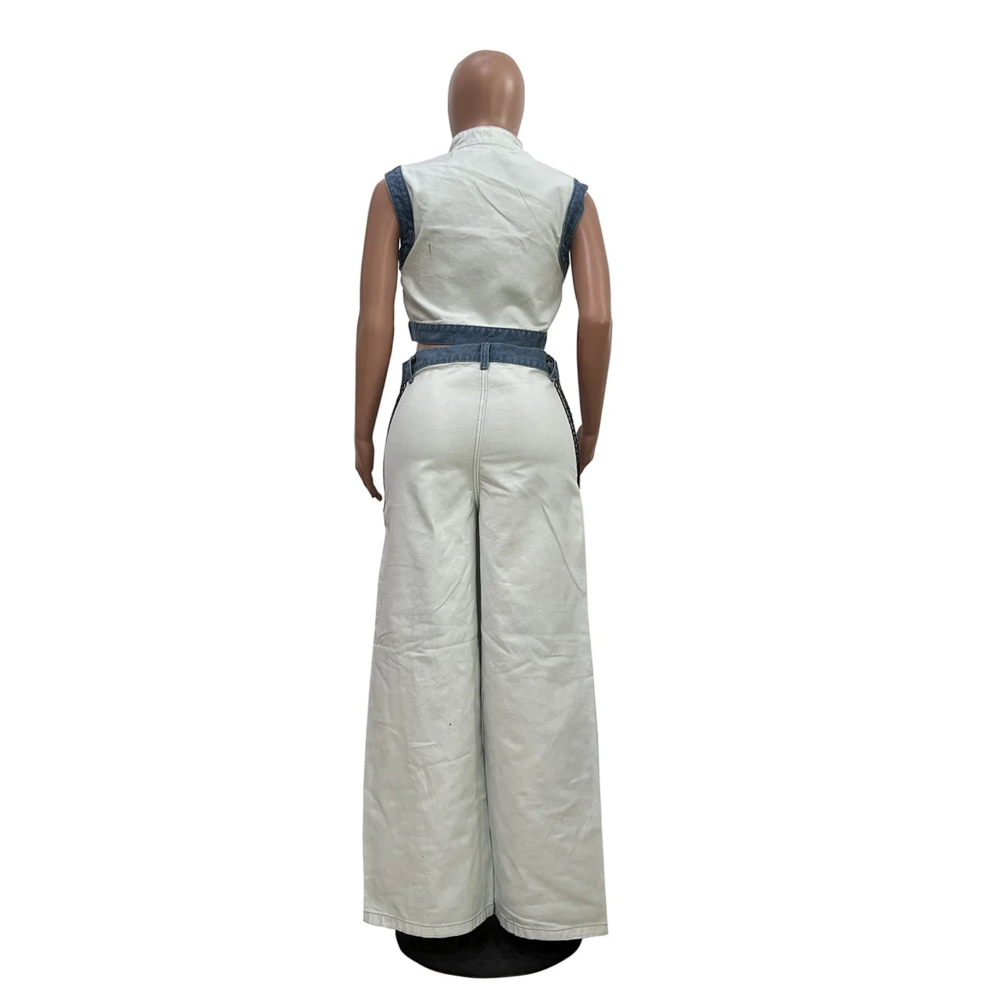 2 Pieces Women's Sets 2025 Spring Summer Denim Sleeveless Suit Tops And Wide Leg Pants Suits Two Piece Set Tracksuit Outfit