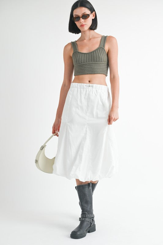 Fit & Length: Designed to sit at the mid-calf, the skirt's bubble hem creates a voluminous effect that flatters various body types and adds a playful dimension to your ensemble.